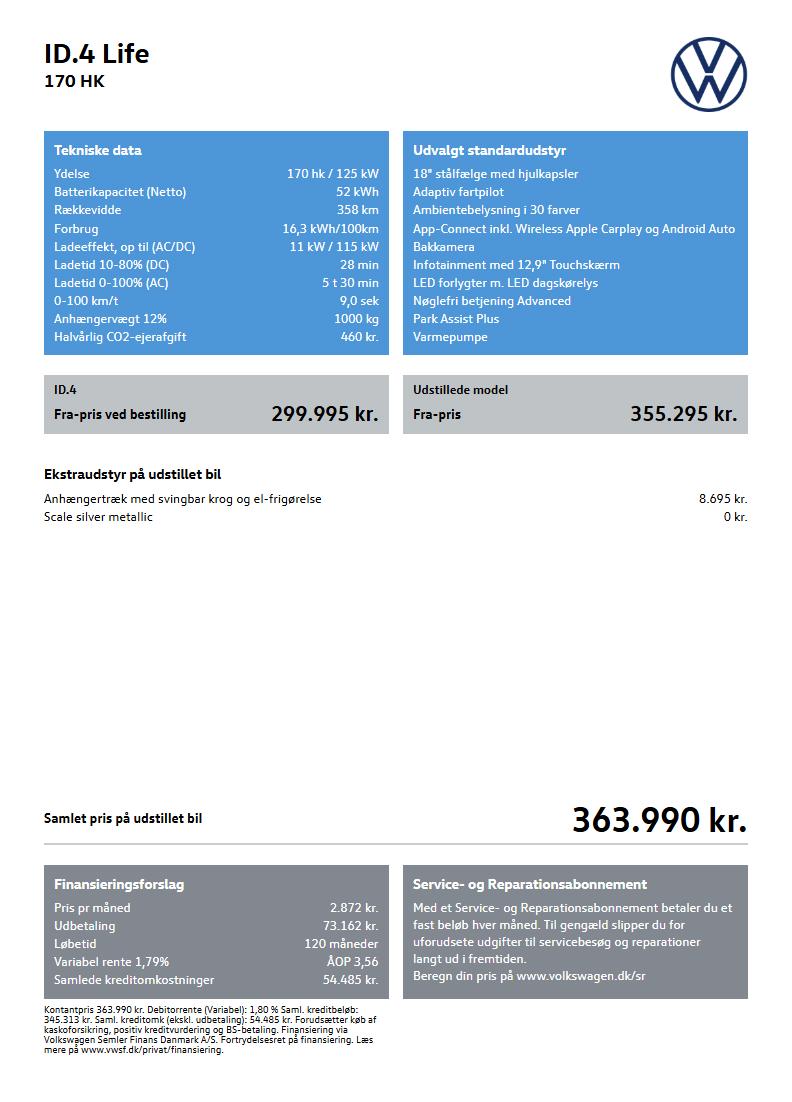 SPAR KR. 124.490,00 PÅ DENNE NÆSTEN NYE ID.4 LIFE I NYESTE UDGAVE !!